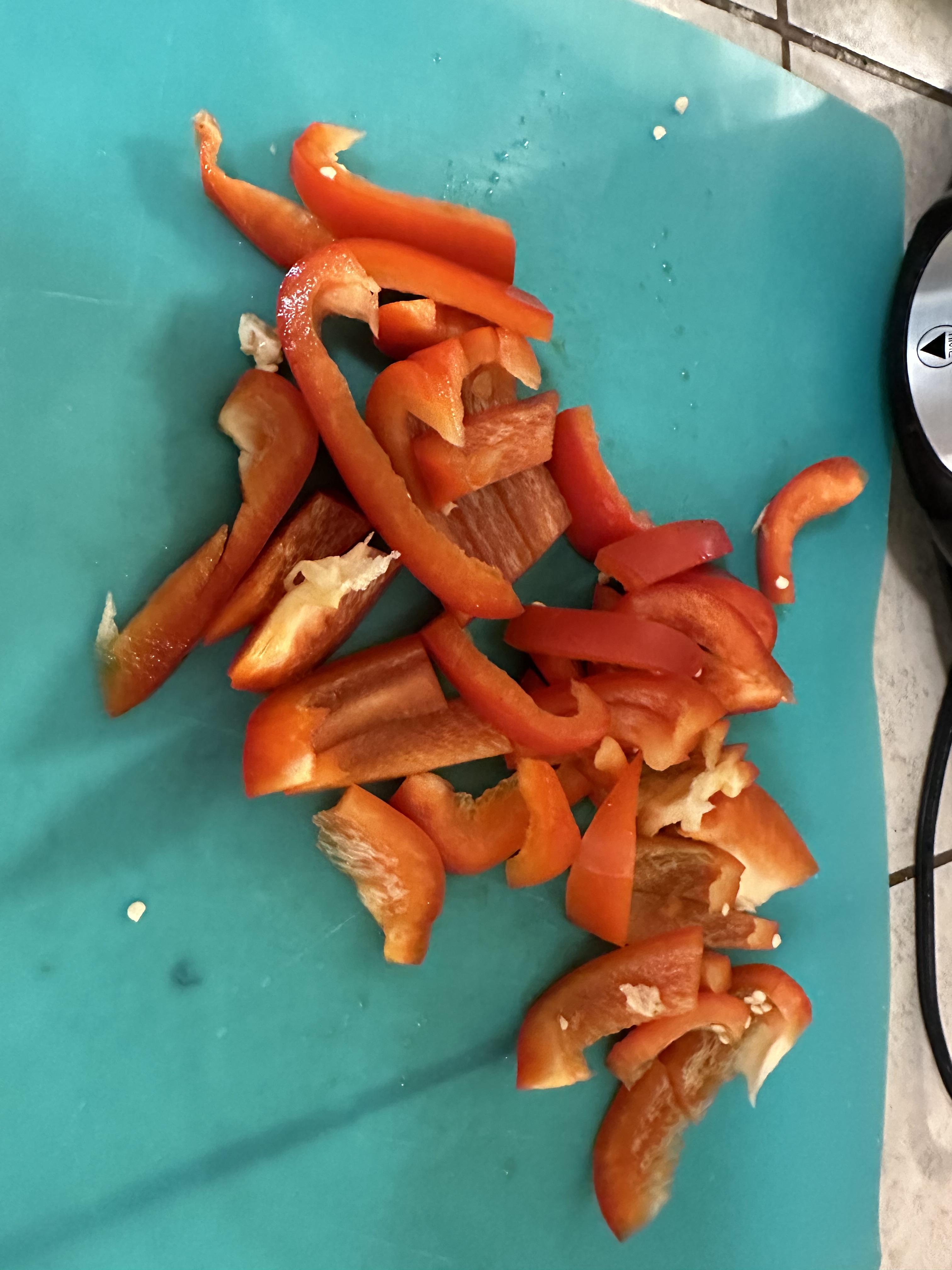 2. Slice red pepper, Rough Chop Cabbage, sliced carrots, and sliced green onions.