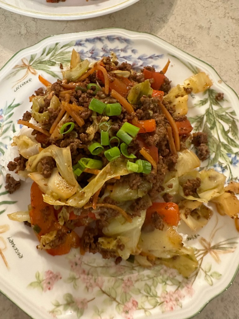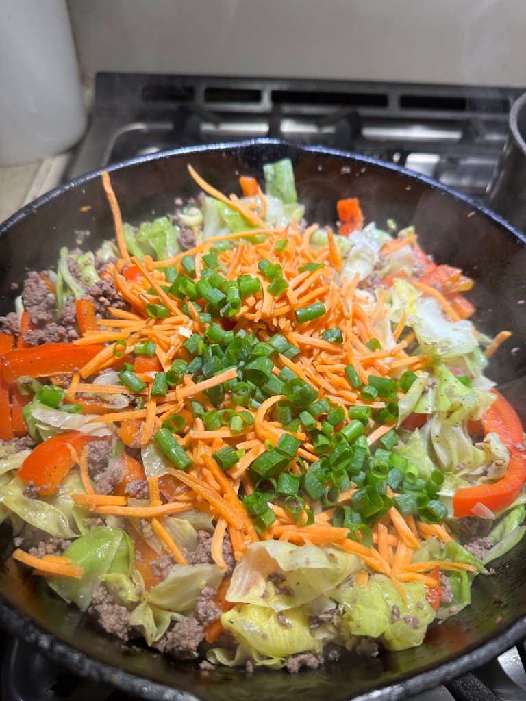 3. Push the ground beef to one side of the pan. Add a tablespoon of sesame oil to the cast iron. Put red pepper in first and allow to soften for about five minutes. Then add cabbage on top. Allow this to steam for about five minutes before stirring. Finally carrots and green onions.