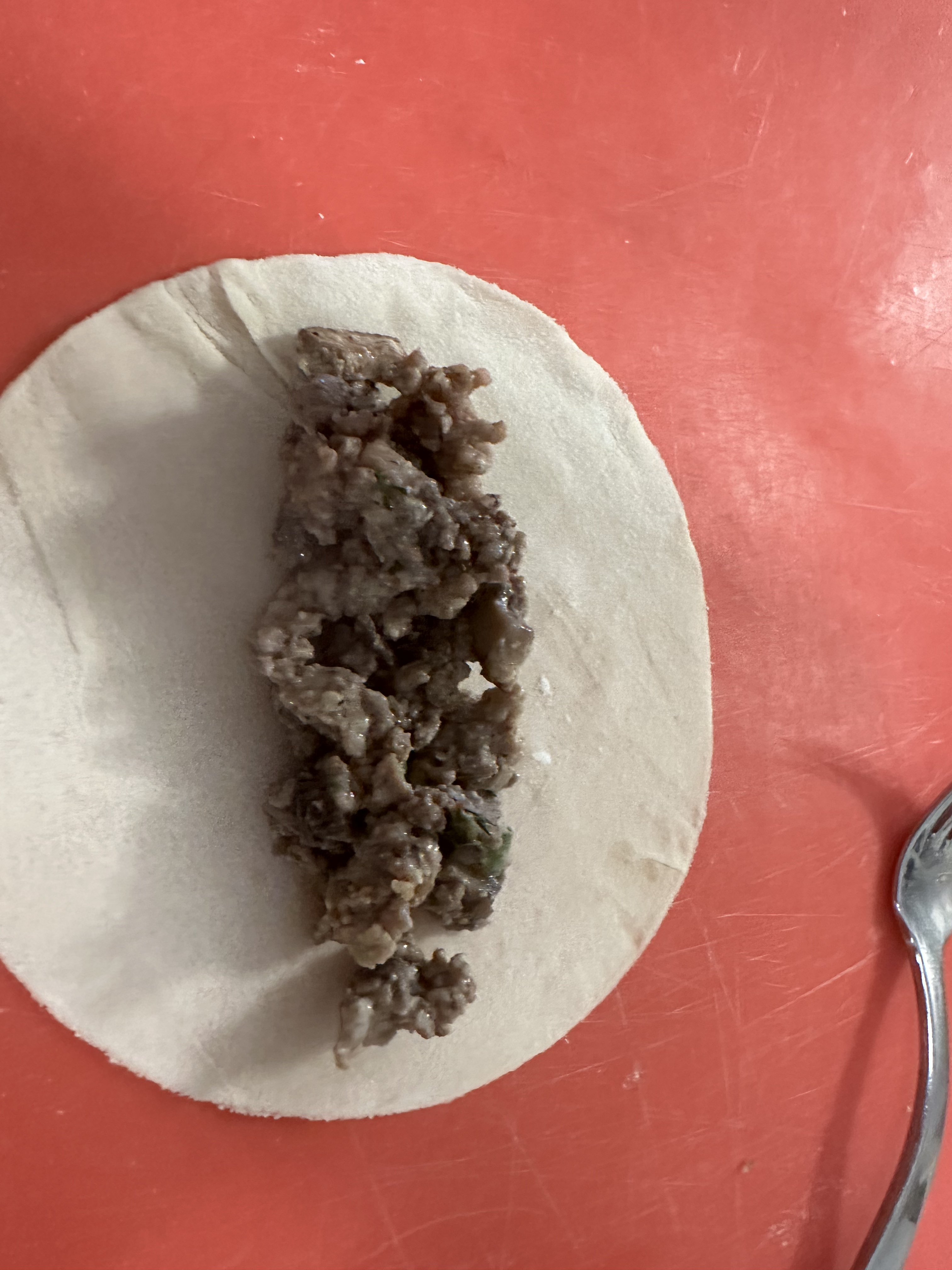 - Put about two teaspoons of the meat mixture into each circle and close the circle in half, using a fork to seal the edges.