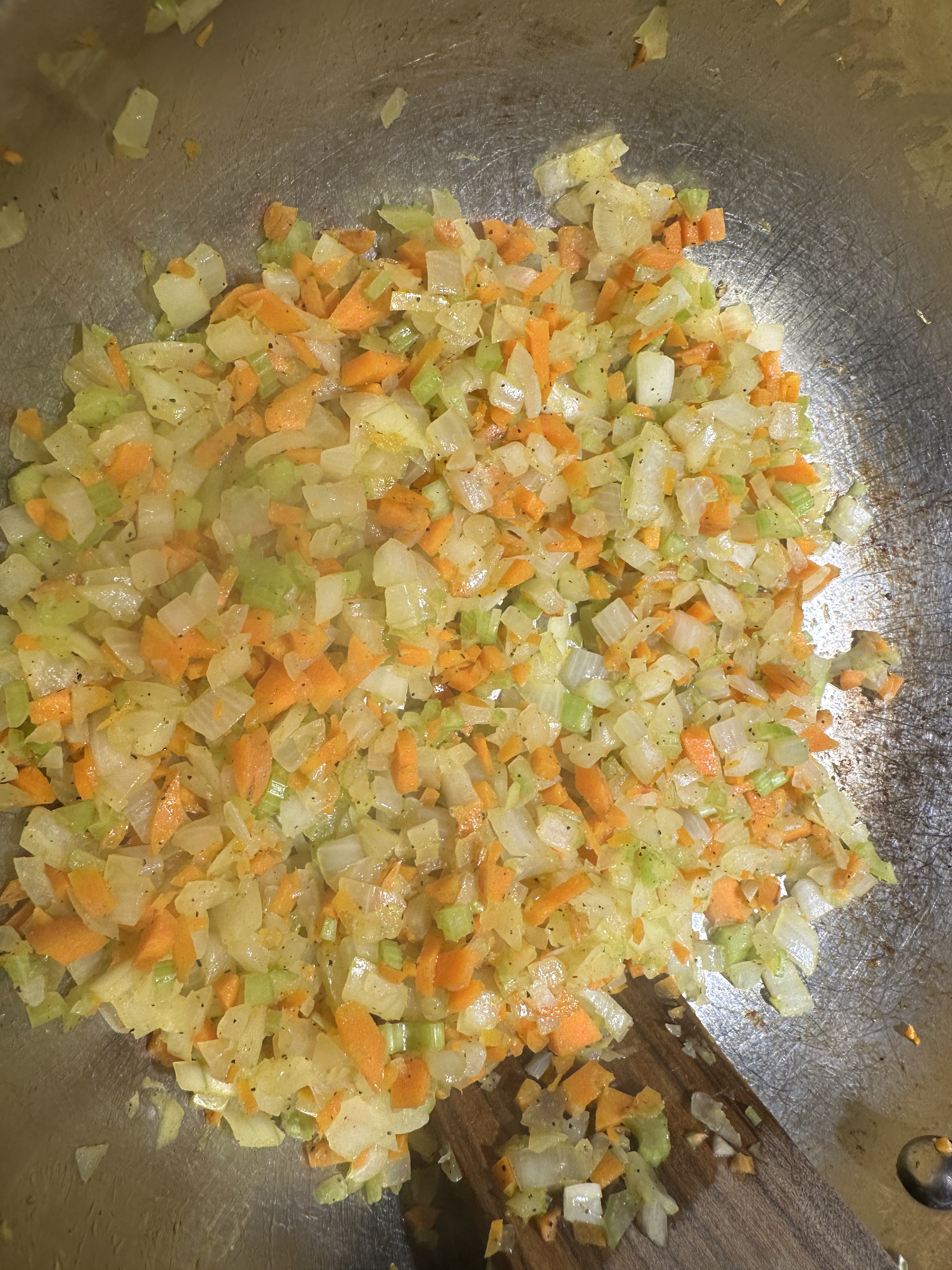 - In a saucepan or Dutch oven, heat oil and cook onion, celery, and carrot until vegetables are soft and onion is translucent. Season with salt and pepper throughout the cooking process. Add garlic and cook another minute or two. (1 onion, 1 carrot, 1 stalk of celery-all diced, 1-2 tsp. minced garlic)