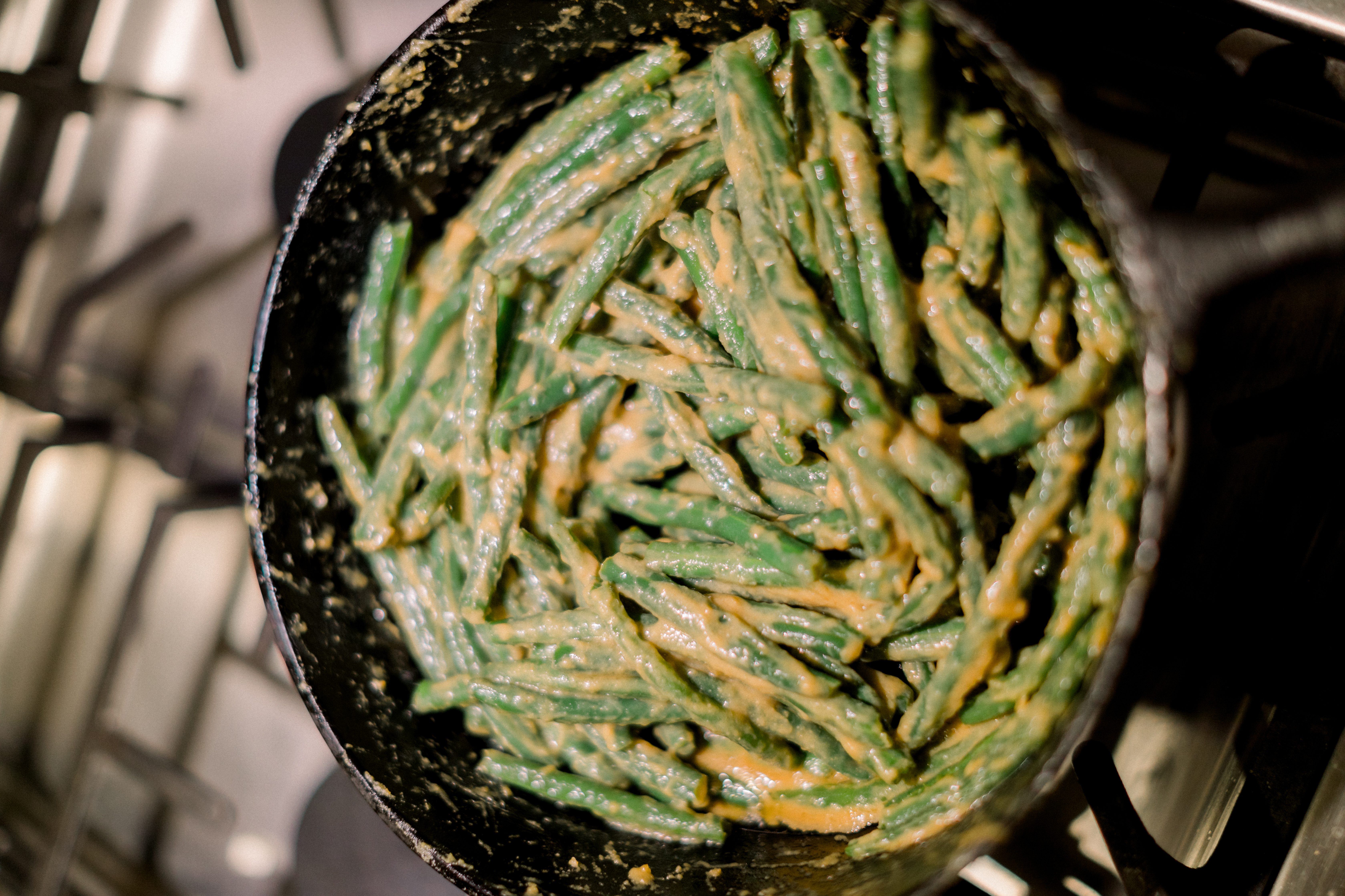 - Pour the butter miso mixture onto the green beans and coat them for about five minutes.