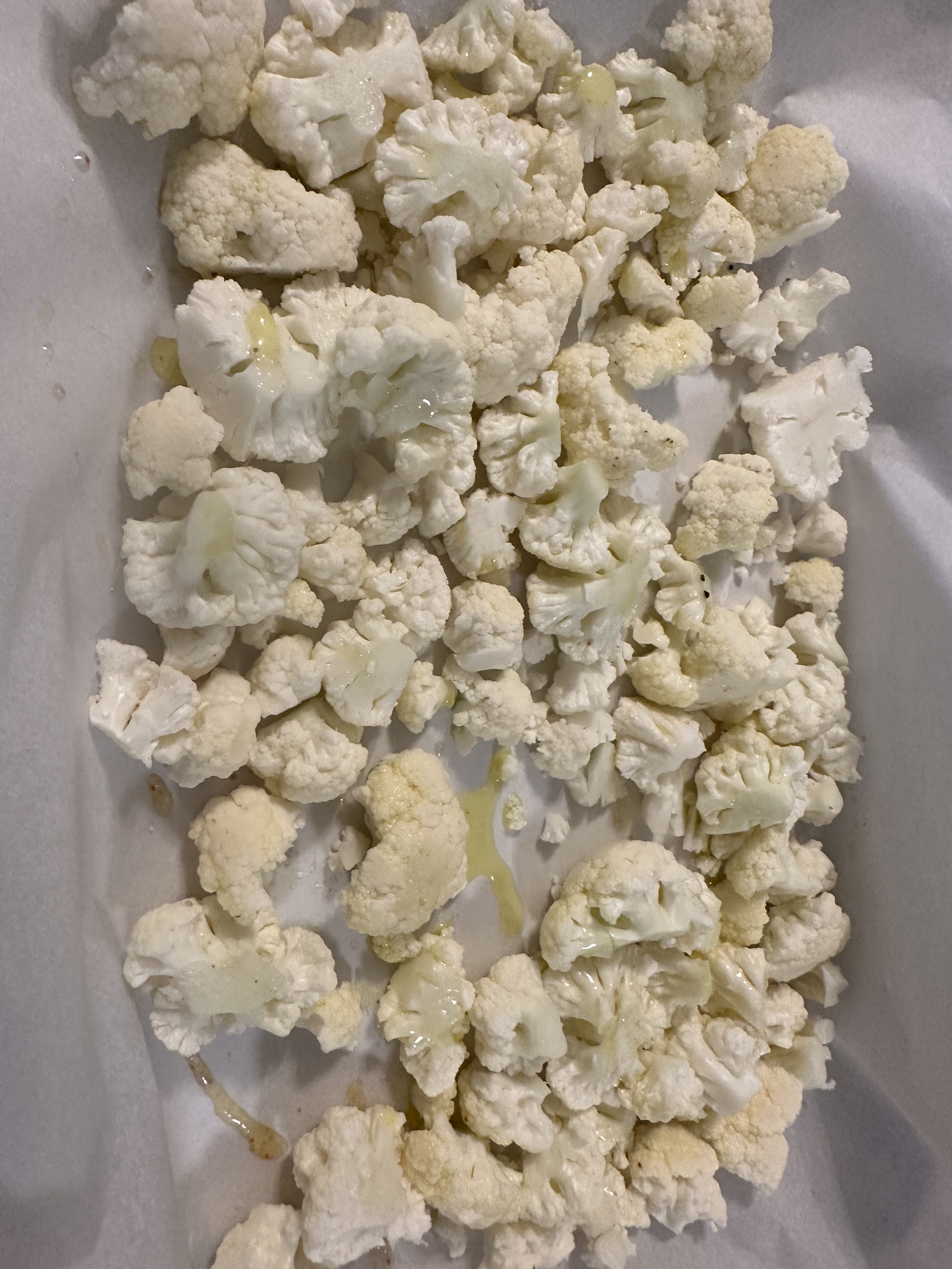 - Lower heat in oven to 350. Cut half of a head of cauliflower into bite size pieces. Place cauliflower on a smaller baking sheet lined with parchment paper. Sprinkle with salt and drizzle with olive oil. Cook for 30 minutes or until roasted.