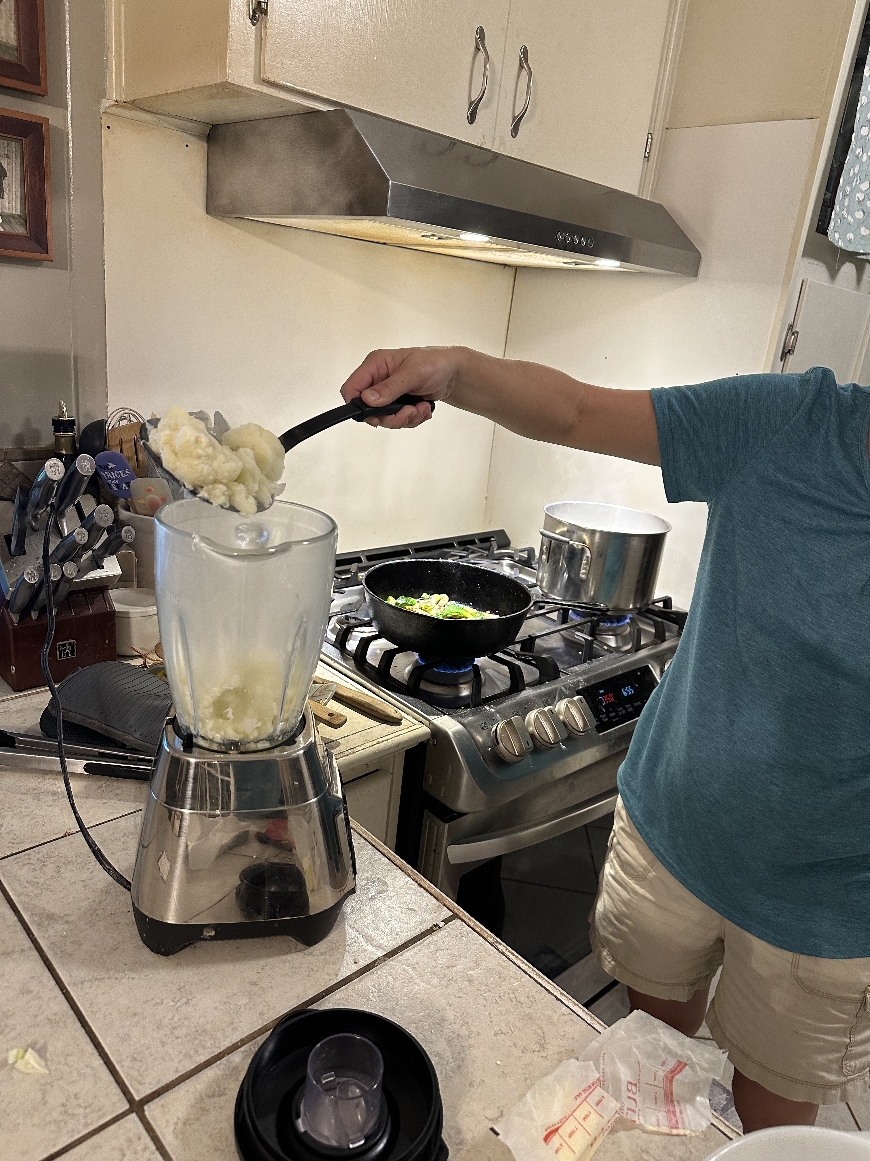 - Using a slotted spoon, put cauliflower into a blender with two tablespoons of butter and a little of the cooked milk, maybe a half of cup. Puree and repeat until all the cauliflower is pureed.