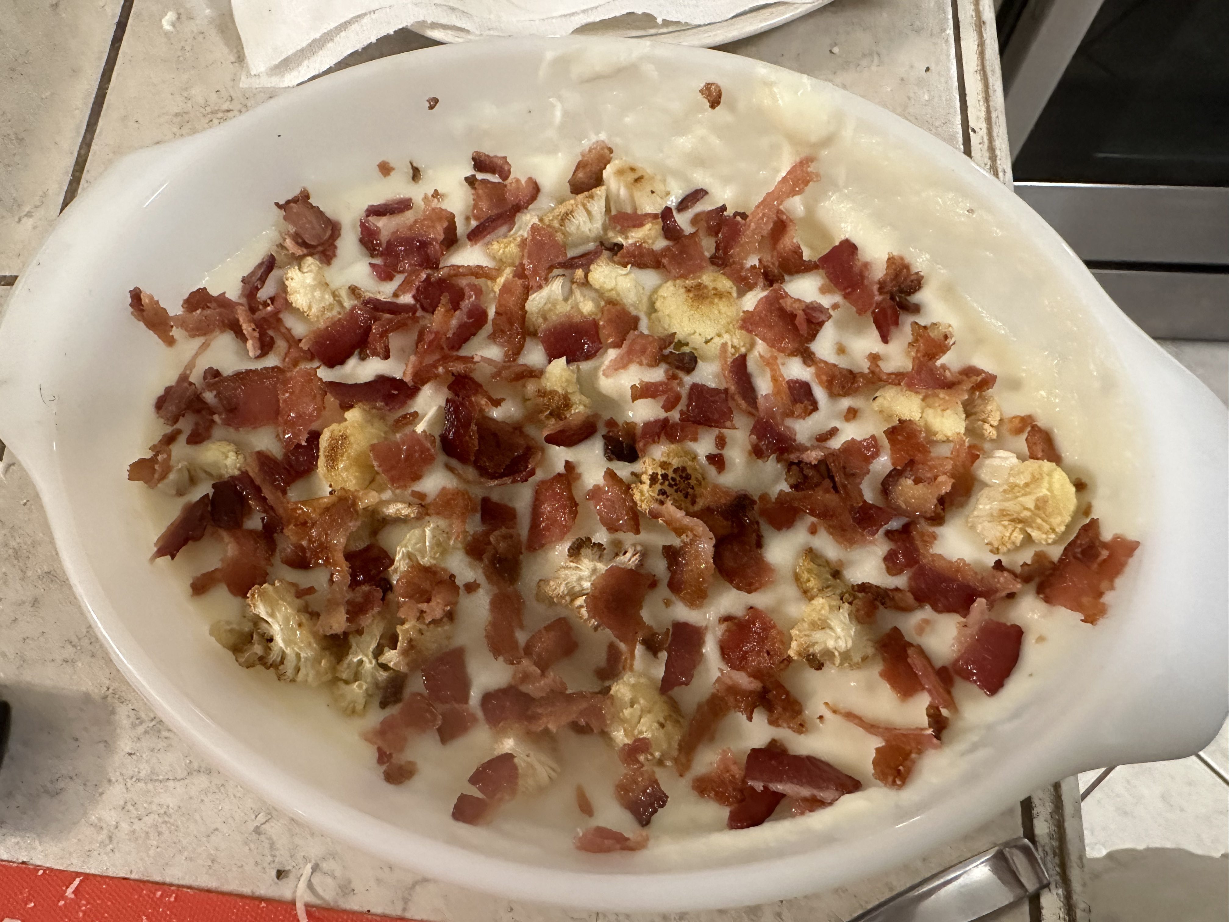 - Sprinkle with crumbled bacon and cauliflower bits. Serve or heat in oven and serve when dinner is ready.
