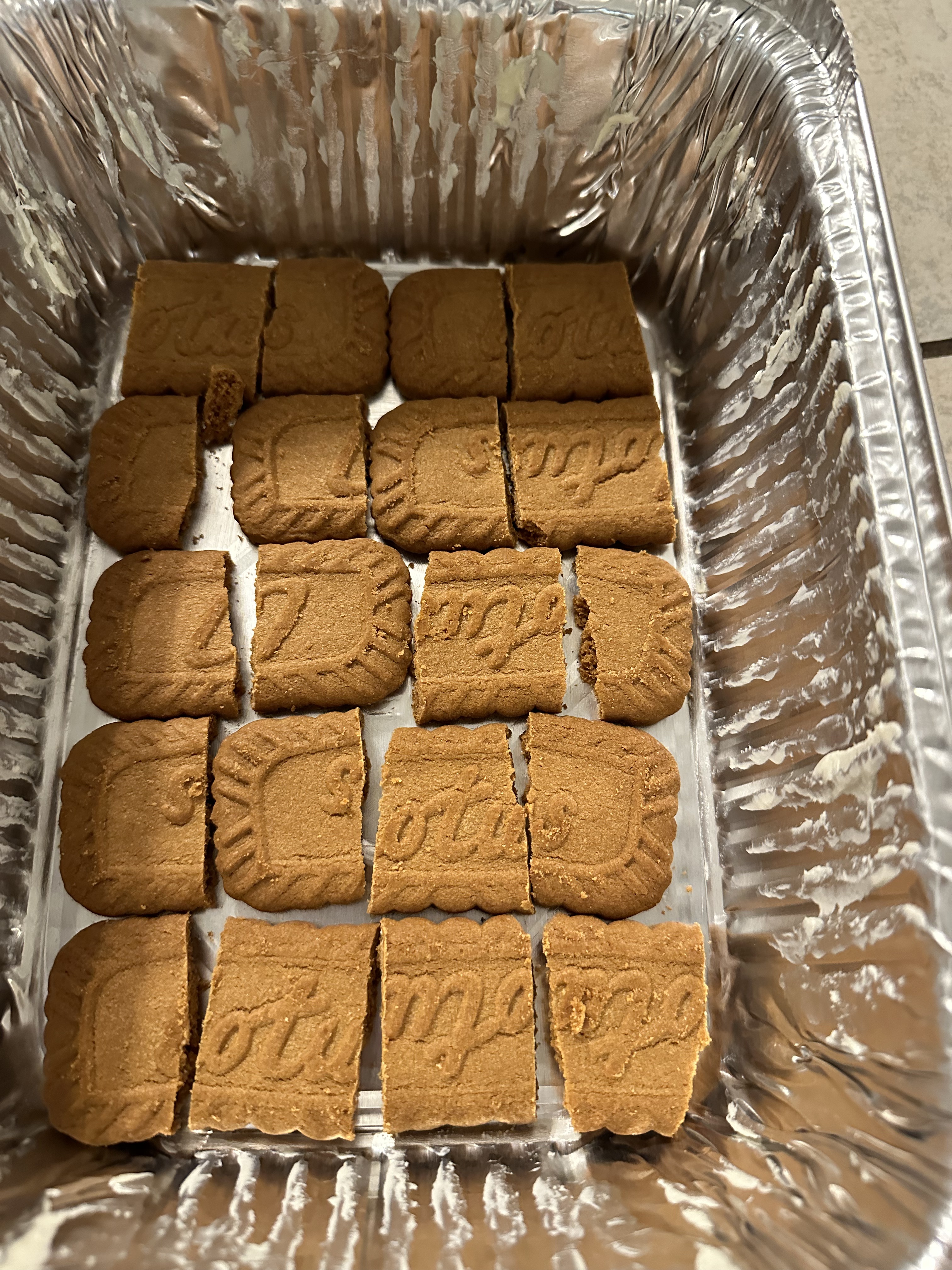 - Cut the Biscoff cookies into three pieces using a bread knife and place a layer into the bottom of your baking dish.