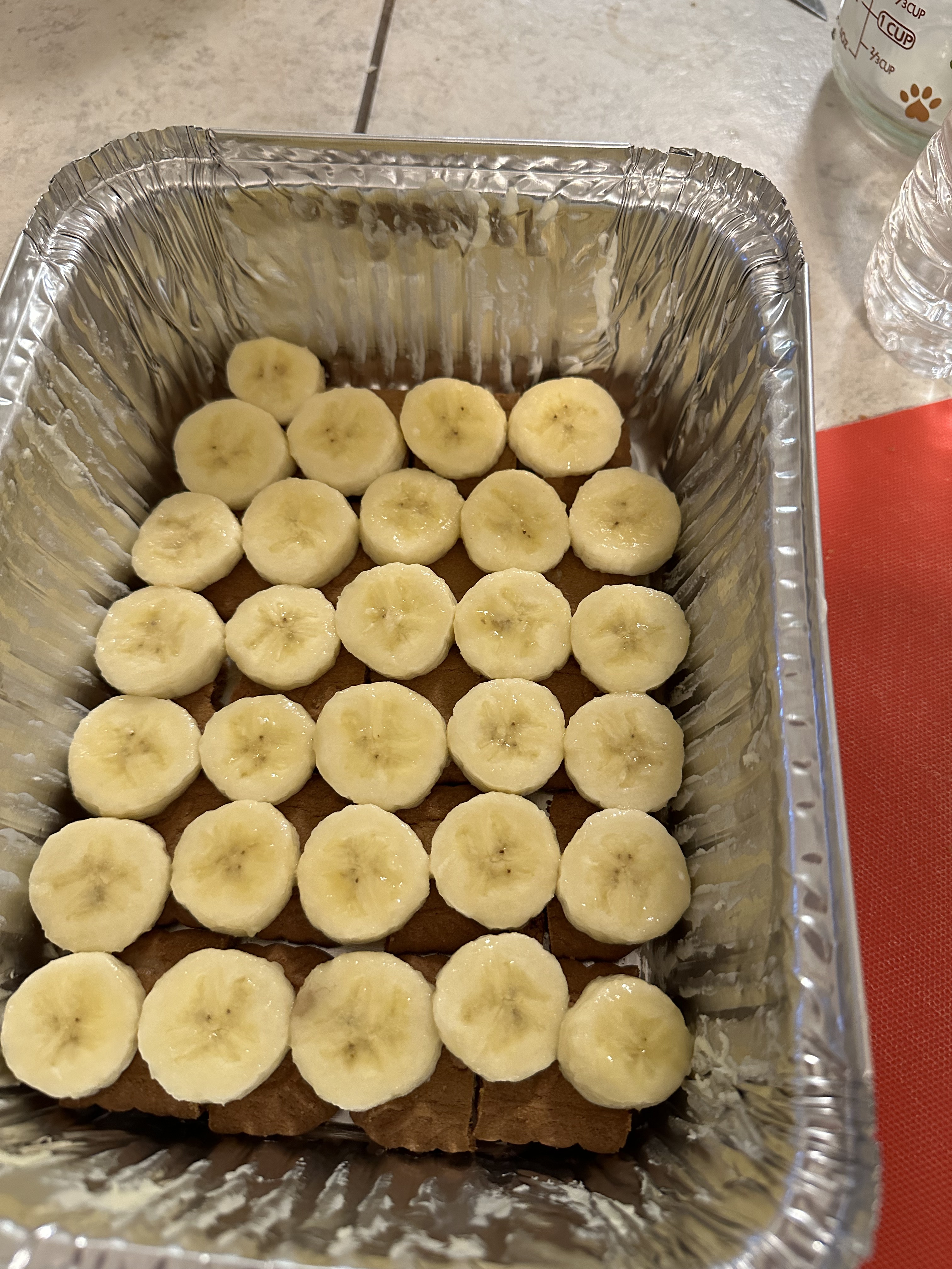 Now, let’s talk about the cookie twist in this banana pudding masterpiece. You might have already noticed that we’re shaking things up with Biscoff cookies instead of the traditional vanilla wafers. My daughters lovingly refer to these as “airplane cookies,” adding a dash of whimsy to our dessert adventure. So, grab a package of Biscoff cookies, and armed with a bread knife, transform each cookie into three even pieces. Now, a quick aside: my father, in his culinary wisdom, once suggested using an actual hacksaw for this task. While I can assure you that a bread knife will get the job done with far less drama, the mental image of a hacksaw-wielding chef is a tempting one. Once your cookies are sliced and ready, lovingly arrange them in a harmonious layer at the bottom of your greased aluminum pan.