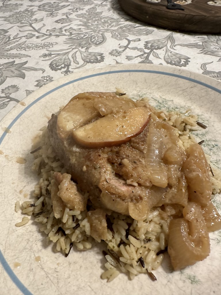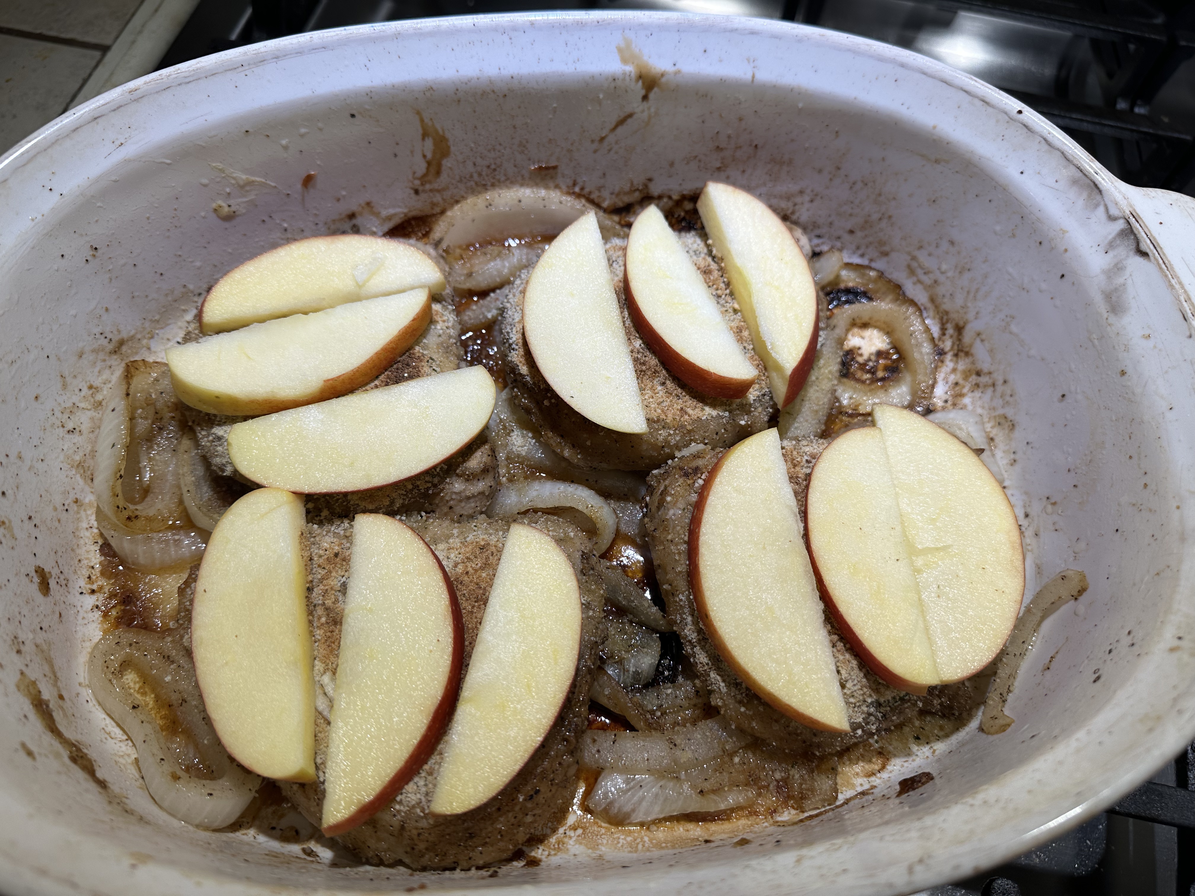 As the oven temperature gracefully transitions to 350 degrees, our pork chops prepare for the next act. Crowned with apple slices, they bask in a pool of chicken broth and sherry, the Dutch oven a cauldron of savory alchemy. A cover is drawn, and the ensemble enters the oven for a one-hour culinary odyssey, where flavors meld and intertwine.