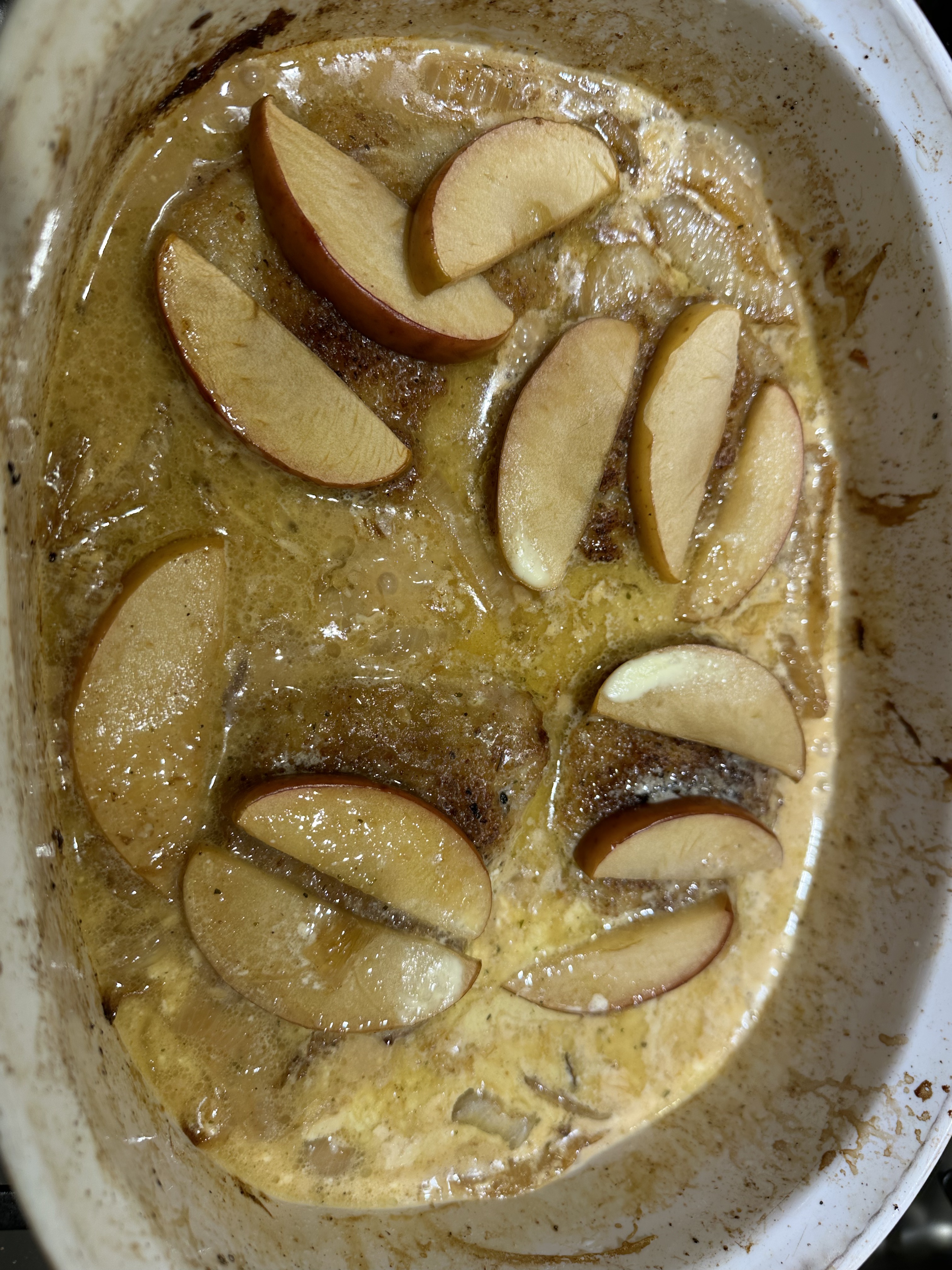- Remove from the oven and lower the heat to bake at 350 degrees. Top the pork chops with the apple slices. And pour the chicken broth and sherry around the pork chops, careful to not overflow the pork chops. Cover the Dutch oven and bake for one hour.