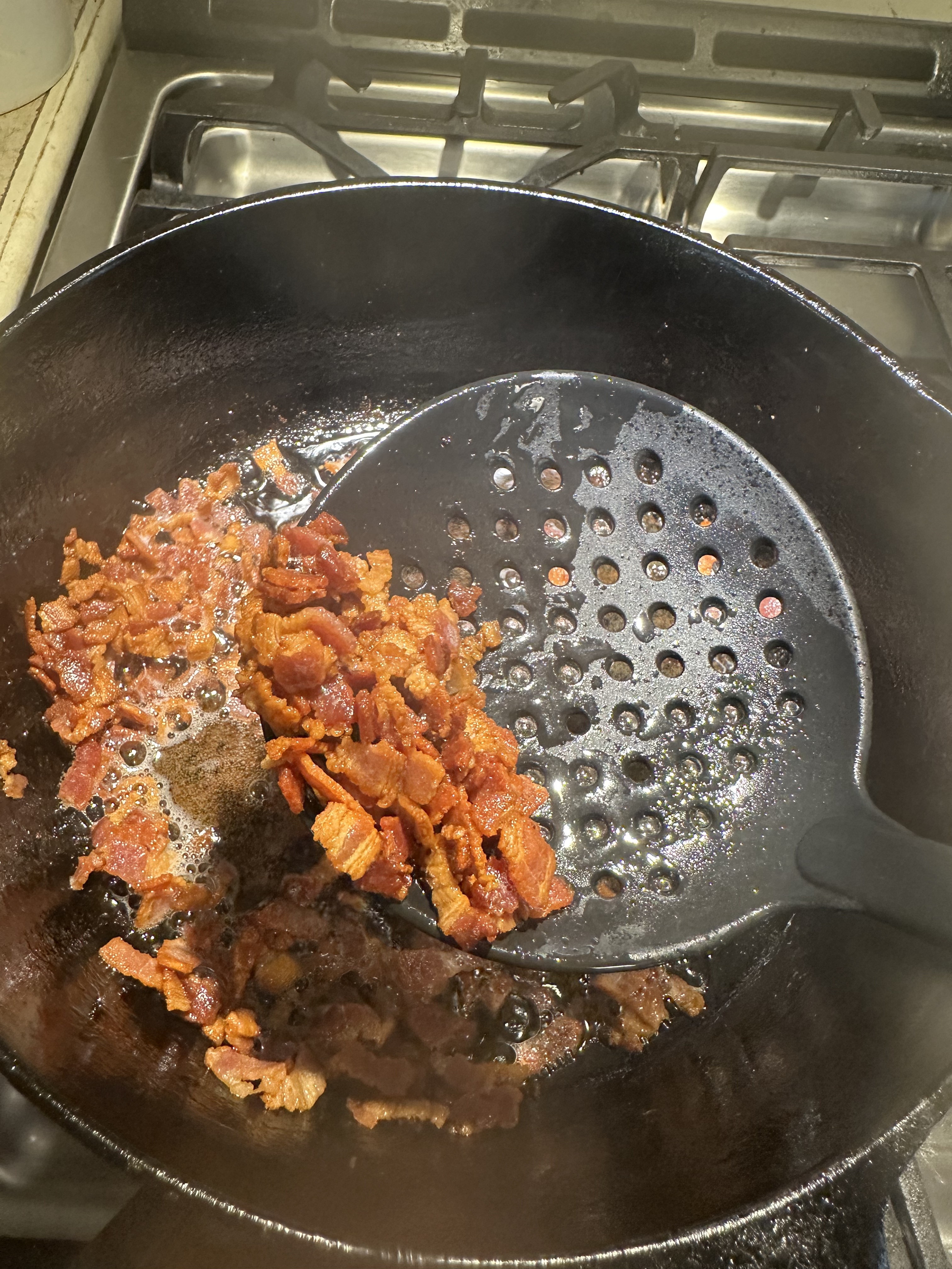 1. In a large cast iron, cook bacon over medium heat until crisp. Put bacon into slow cooker.