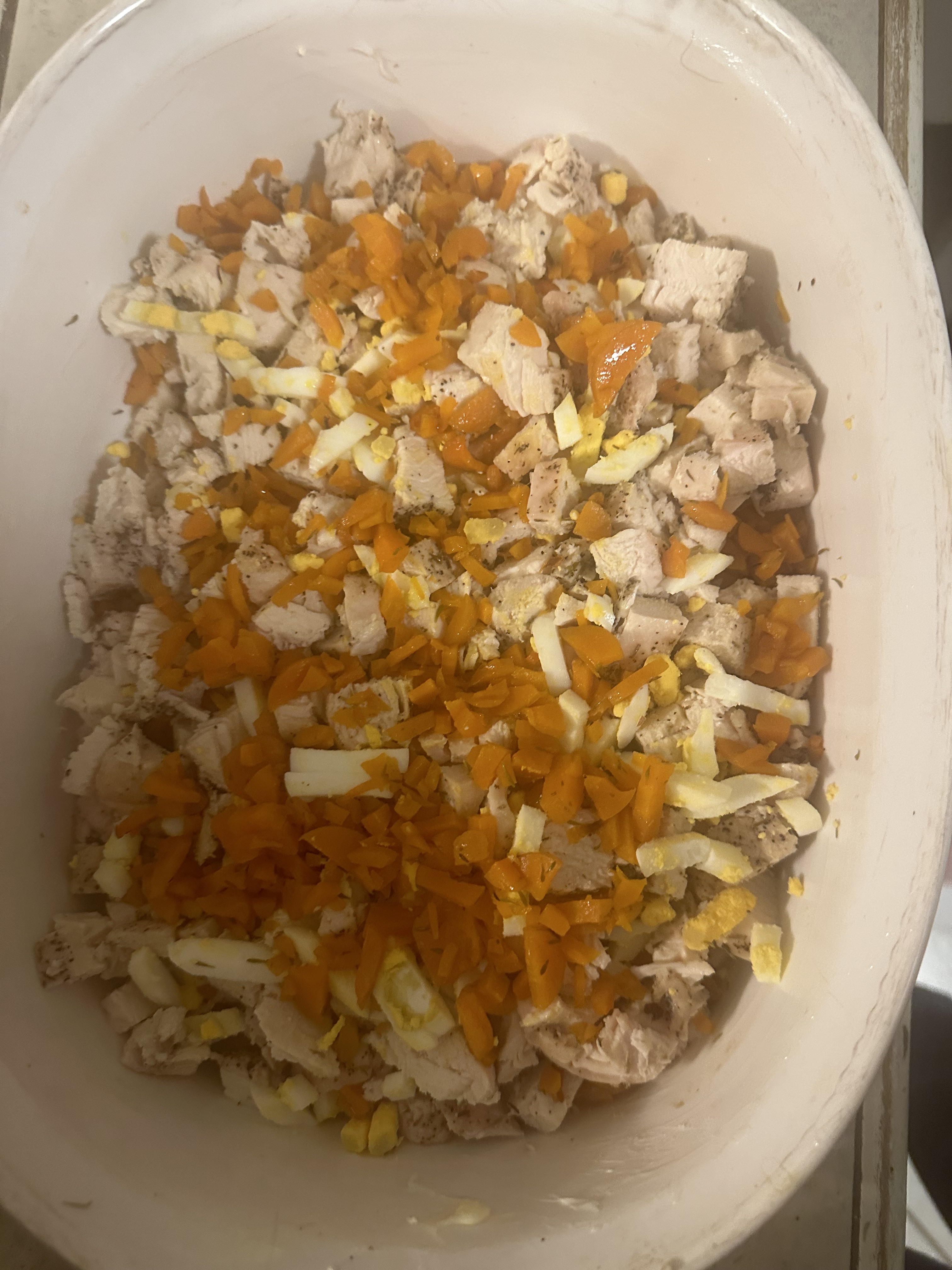 - Layer bite sized chicken pieces, eggs, and vegetables into a deep oven safe dish
