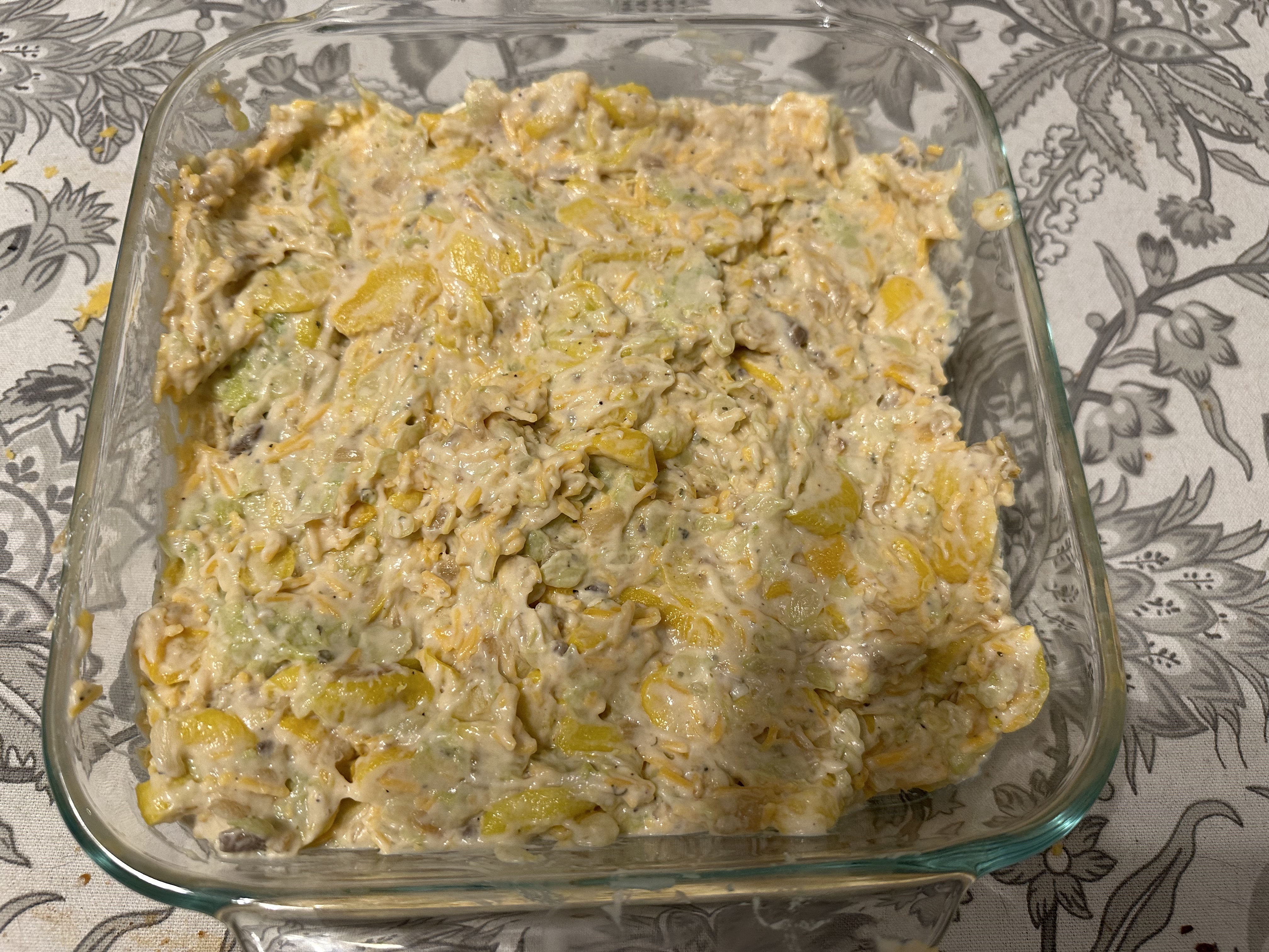 In a spacious mixing bowl, assemble the cast of characters for this culinary ensemble: the blanched squash, now primed and ready, joins forces with the sautéed onions, creating a duet of textures and flavors. To this medley, add the rich notes of cheddar cheese, the creamy overtures of sour cream, the velvety crescendo of cream of mushroom soup, and the binding harmony of a single egg. With a gentle fold and a culinary cadence, unite these ingredients until a harmonious melody echoes through the bowl.