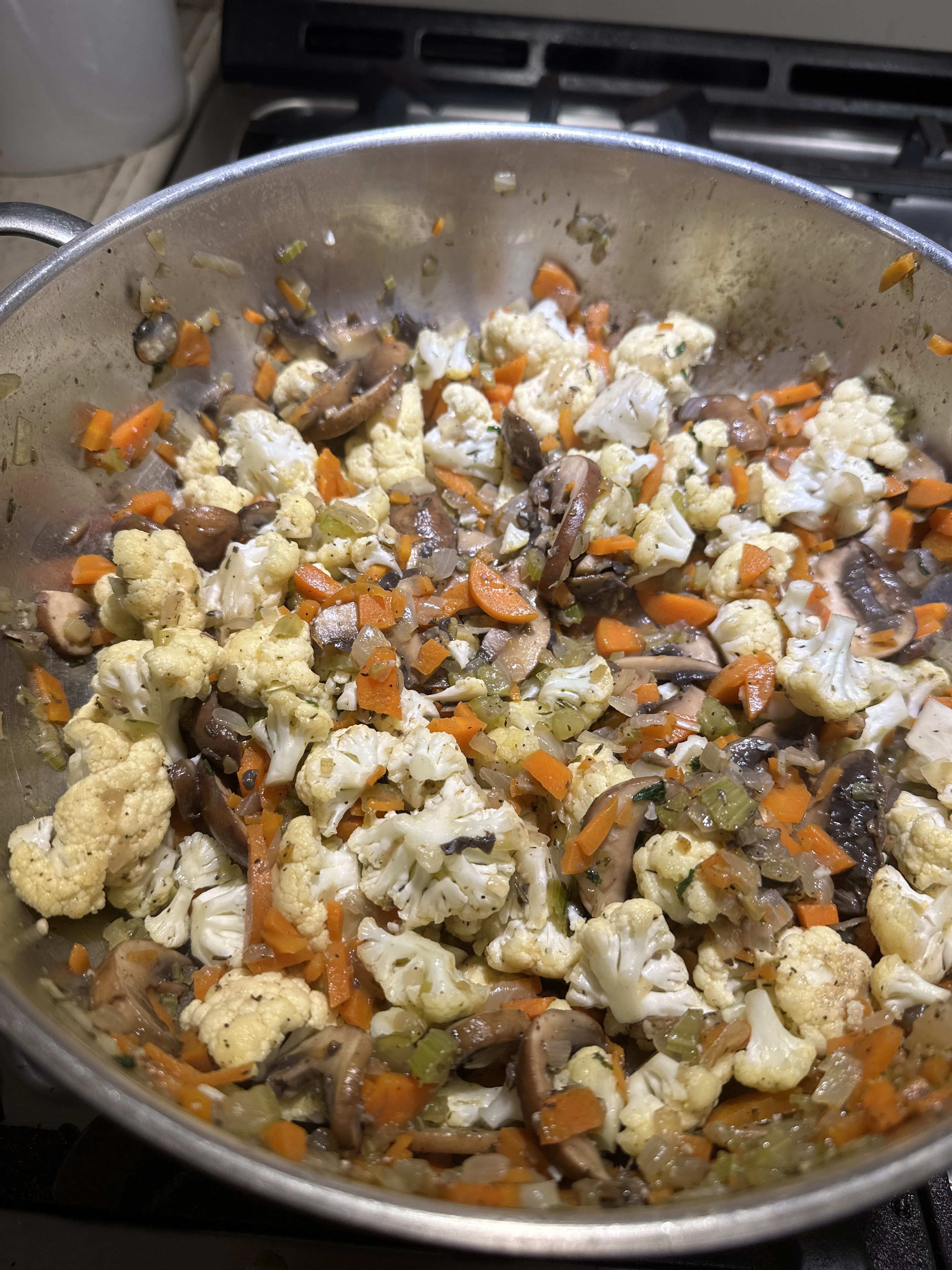 - Add the mushrooms and sauté until softened then add the cauliflower and cook until it has softened.